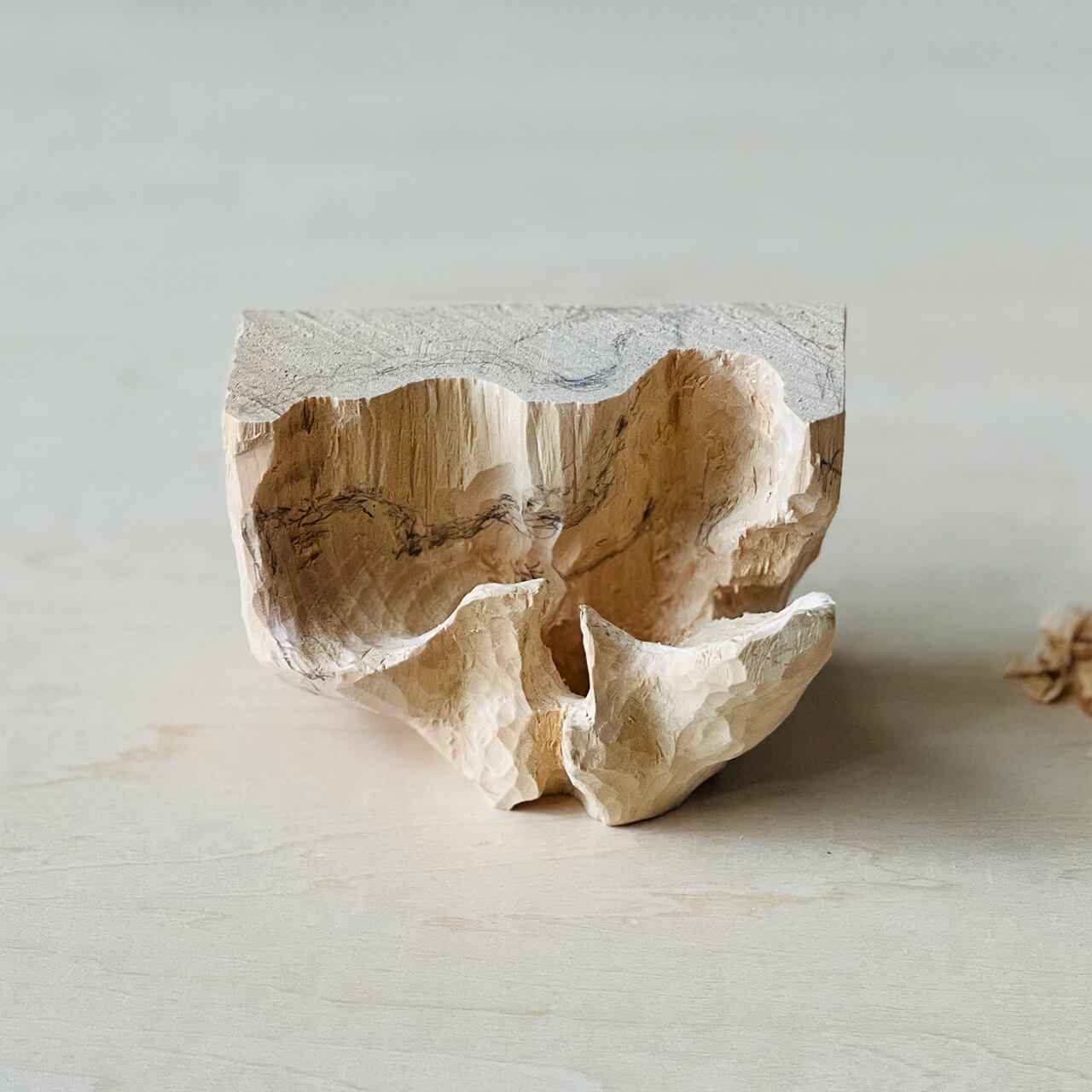 手の中にすっぽりと収まる小さな木彫りの樹木。わたしの手は小さいので、あなたの手にこの作品を載せた場合、この作品の大きさがさらに小さく感じるでしょう。
