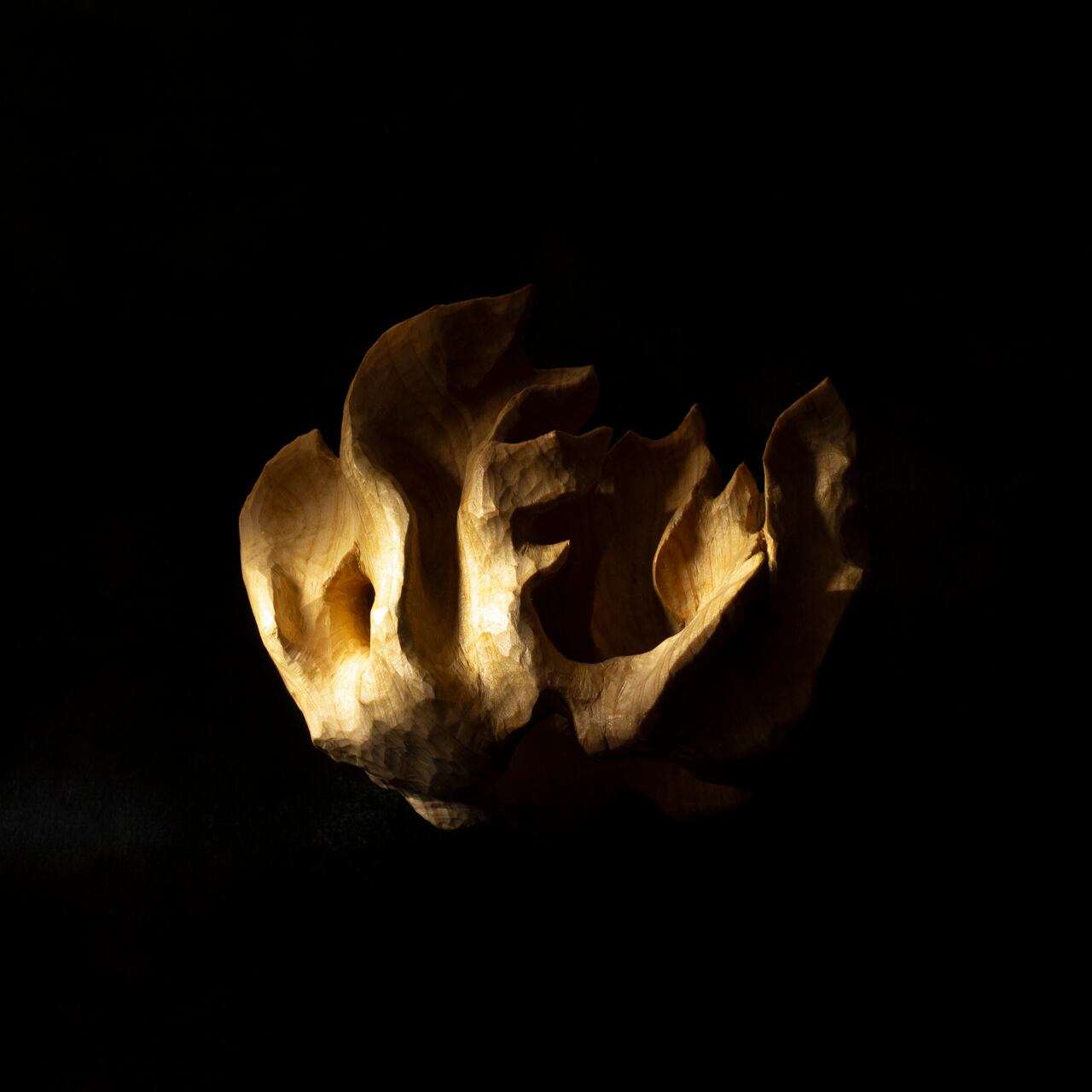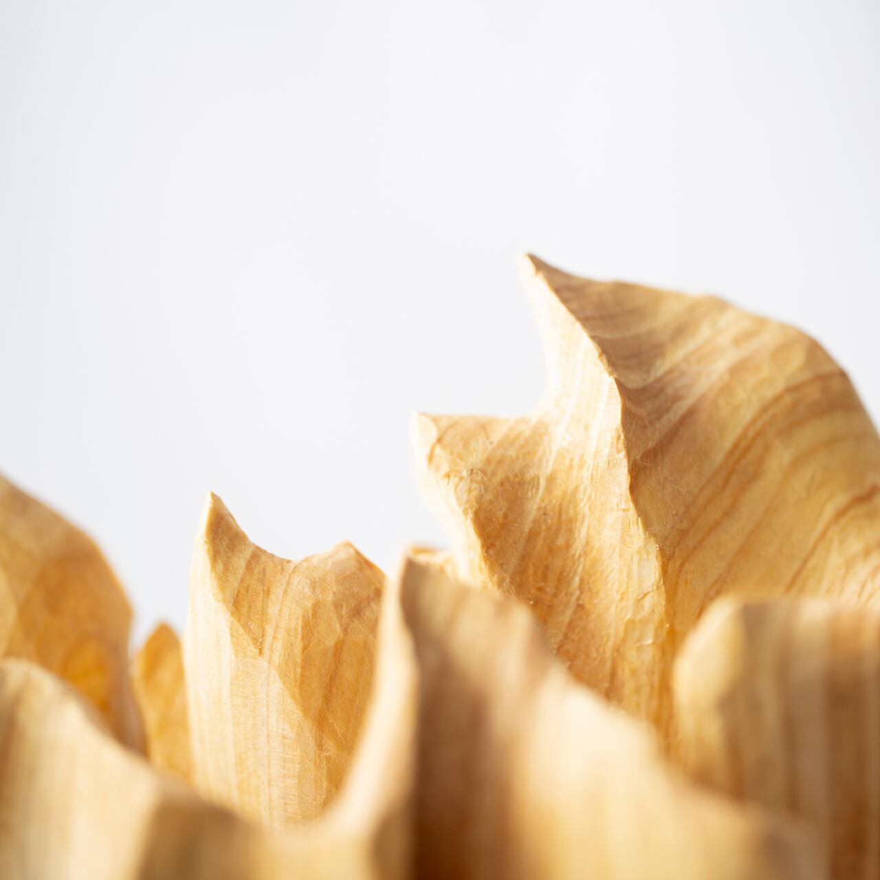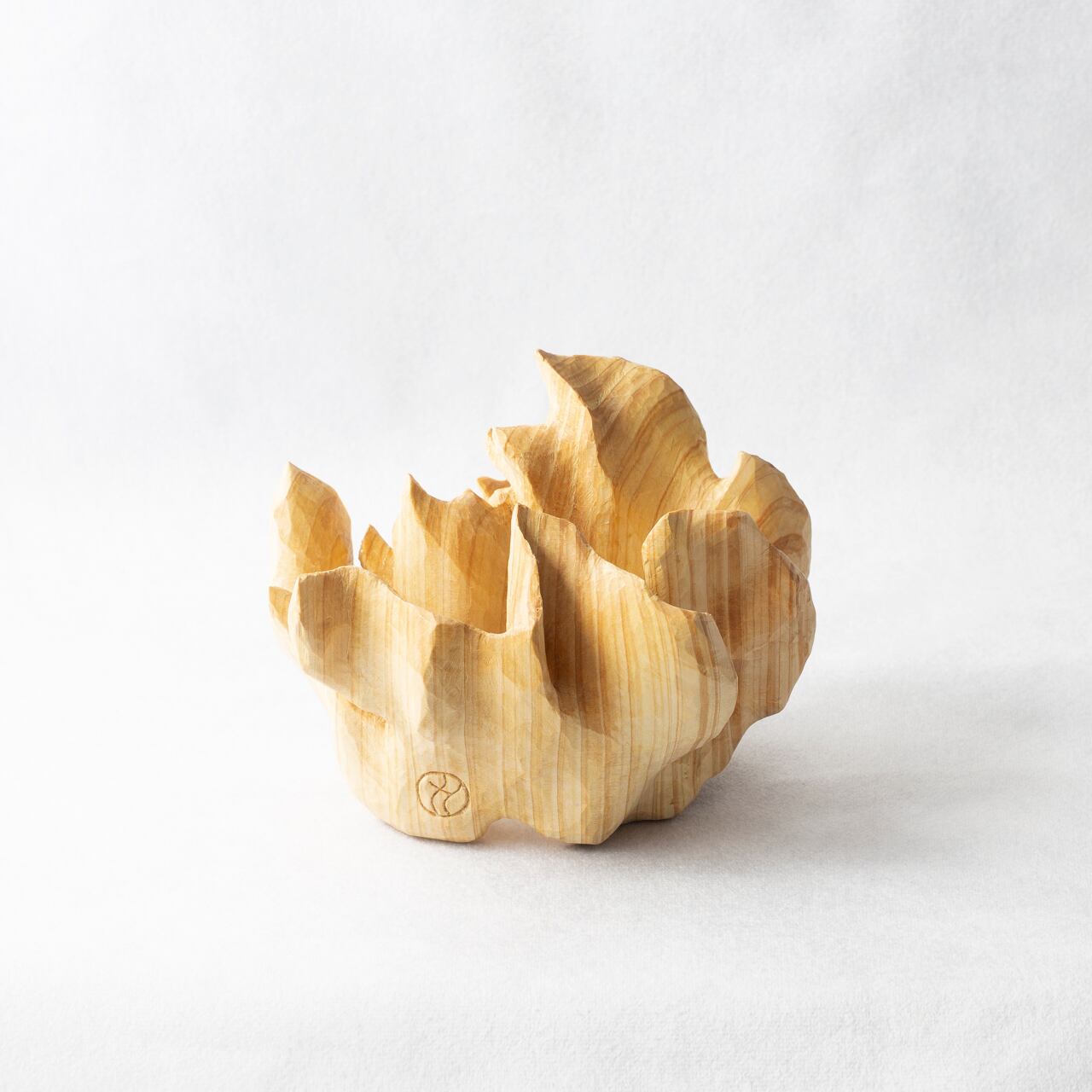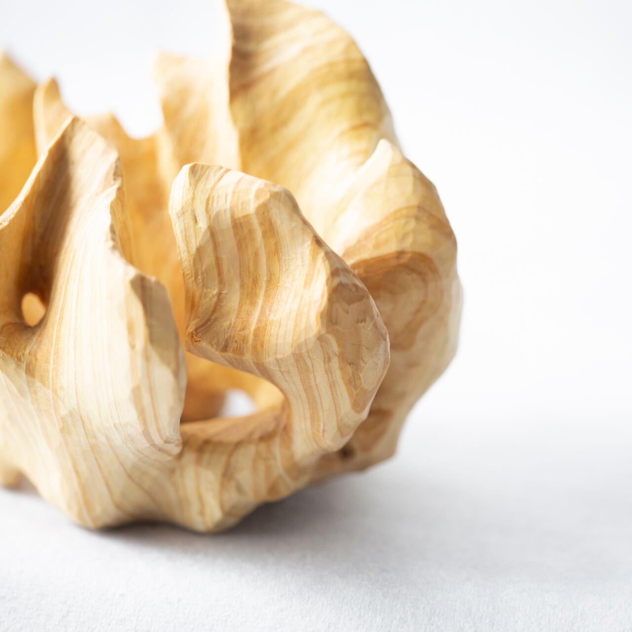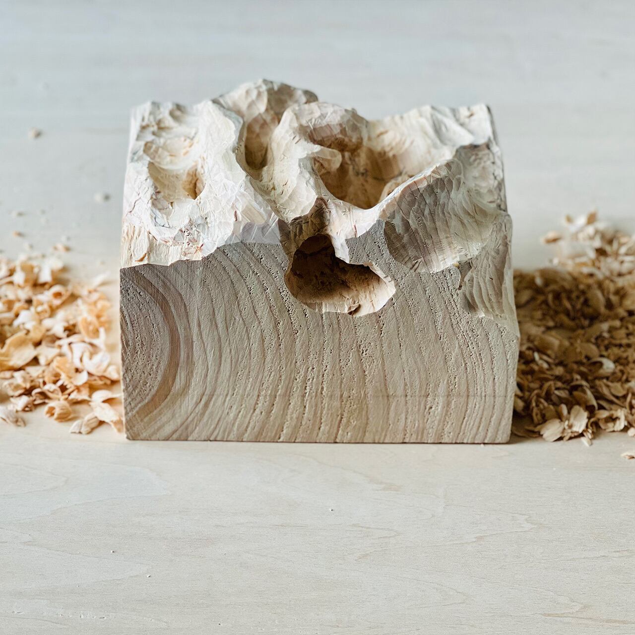The wood used was near the core of the tree. There you can see particularly interesting changes in the width and color. The wood grain depends on the tree, and it also depends on the location and size of the wood. Furthermore, as I carve, various shapes of curves appear.