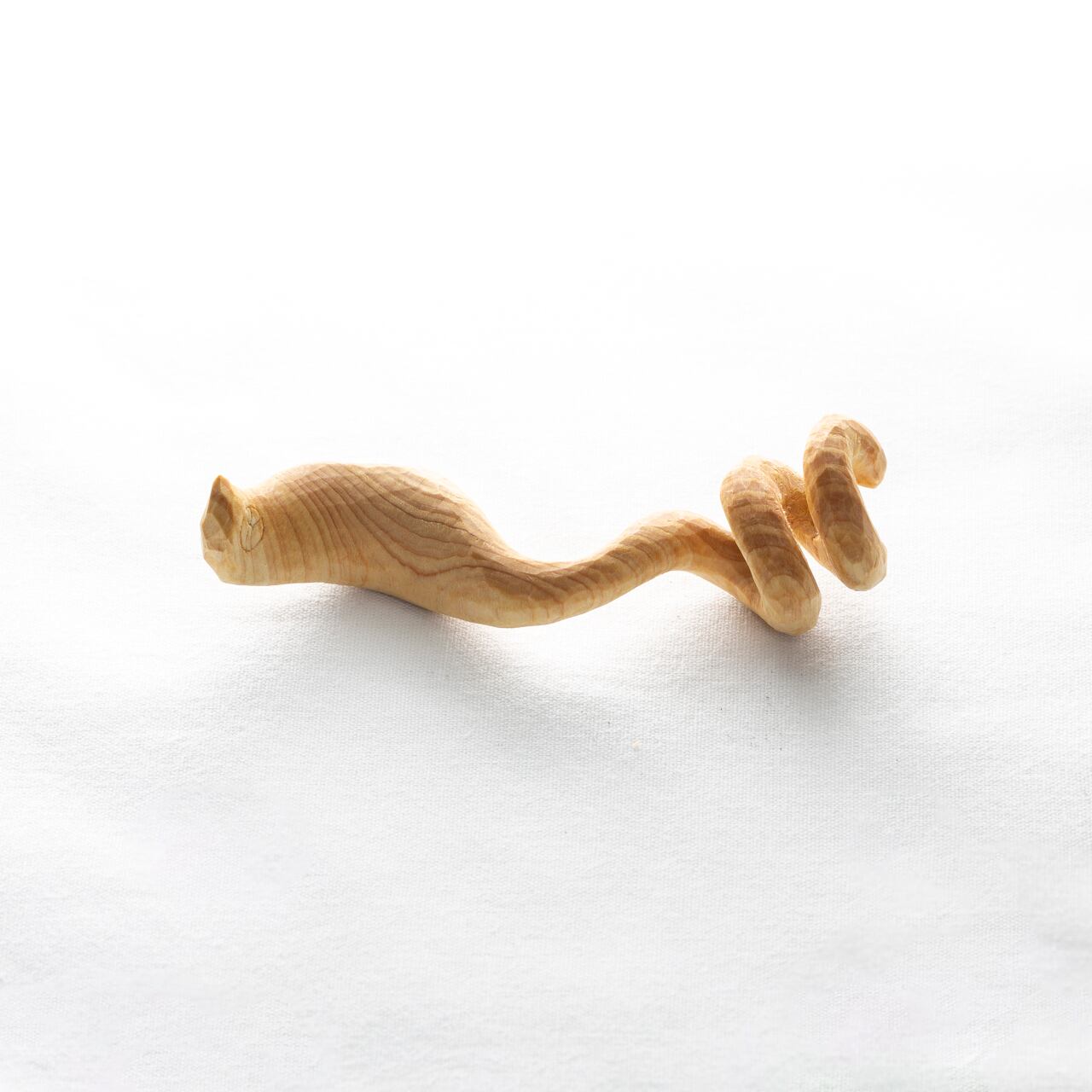 絡み合う枝、特につるの木を表現してみました。螺旋の円の幅は3cmに満たない大きさなので、それを形づくることは大変難しい作業でした。重さは7gです。この作品をつくることで、小さな木片でも多くの課題に取り組むことができることを思い出しました。曲線を彫ることは、どのような曲線か、その大きさや太さや細さや幅、そして三次元の空間内をどのように描かせるか、そのデザインの可能性は無限大です。