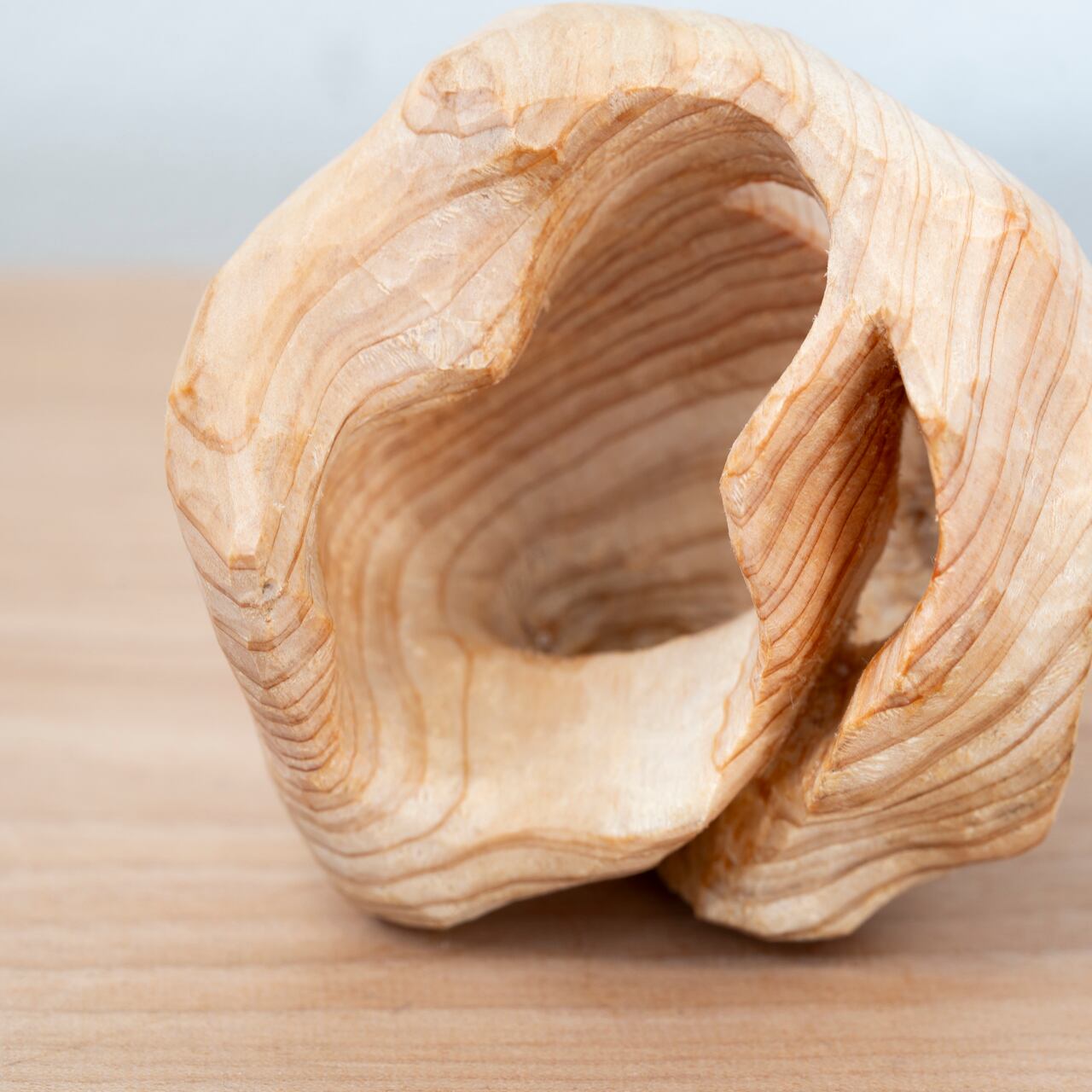 Looking in the inner space. The clear grain of the cypress wood varies in thickness, darkness and color. When I carve it, each line creates an interesting shape.