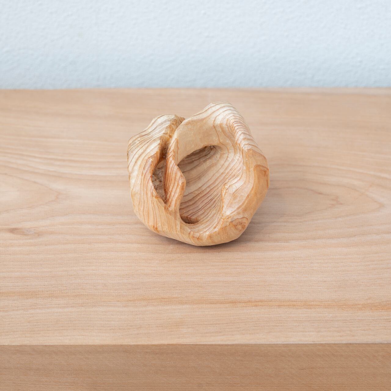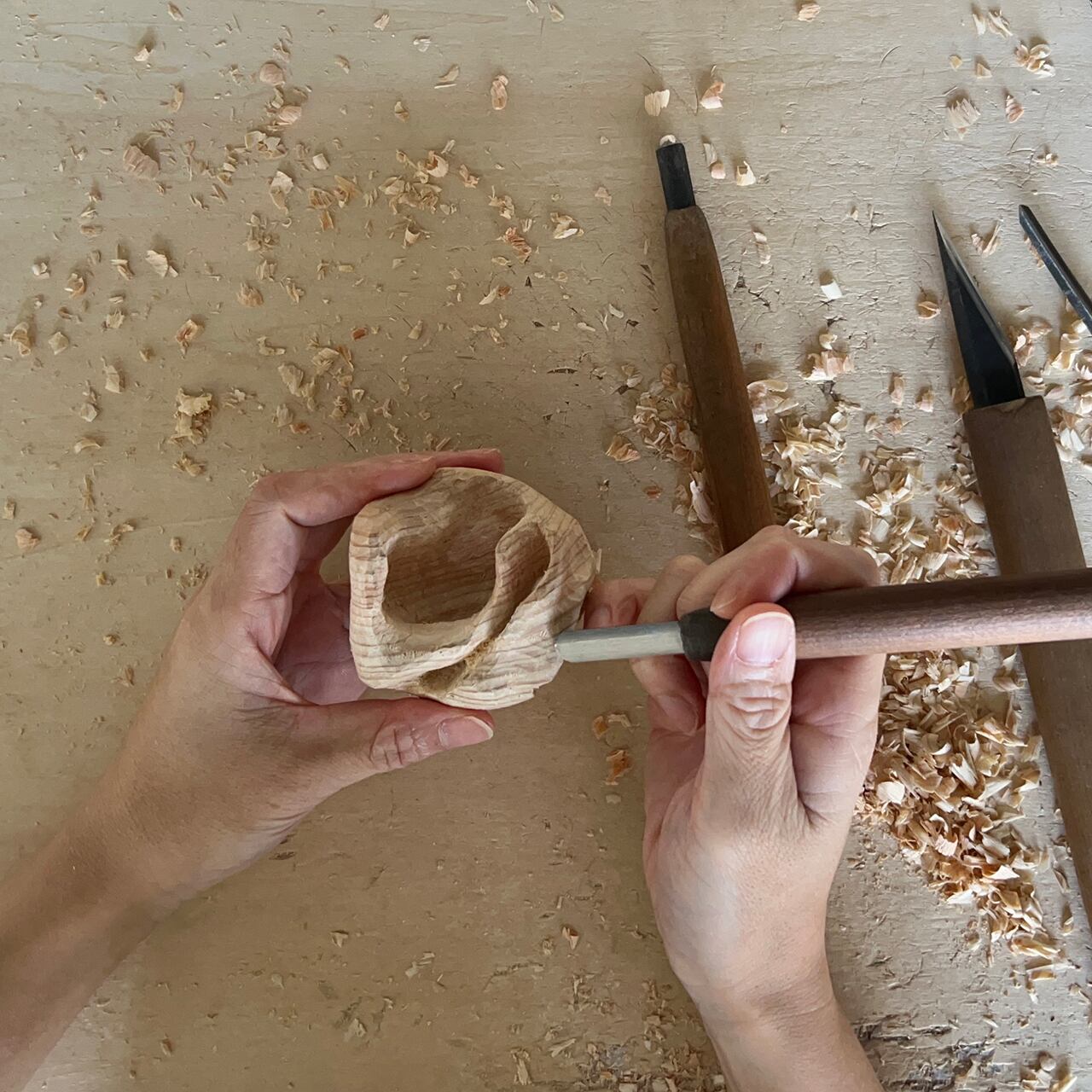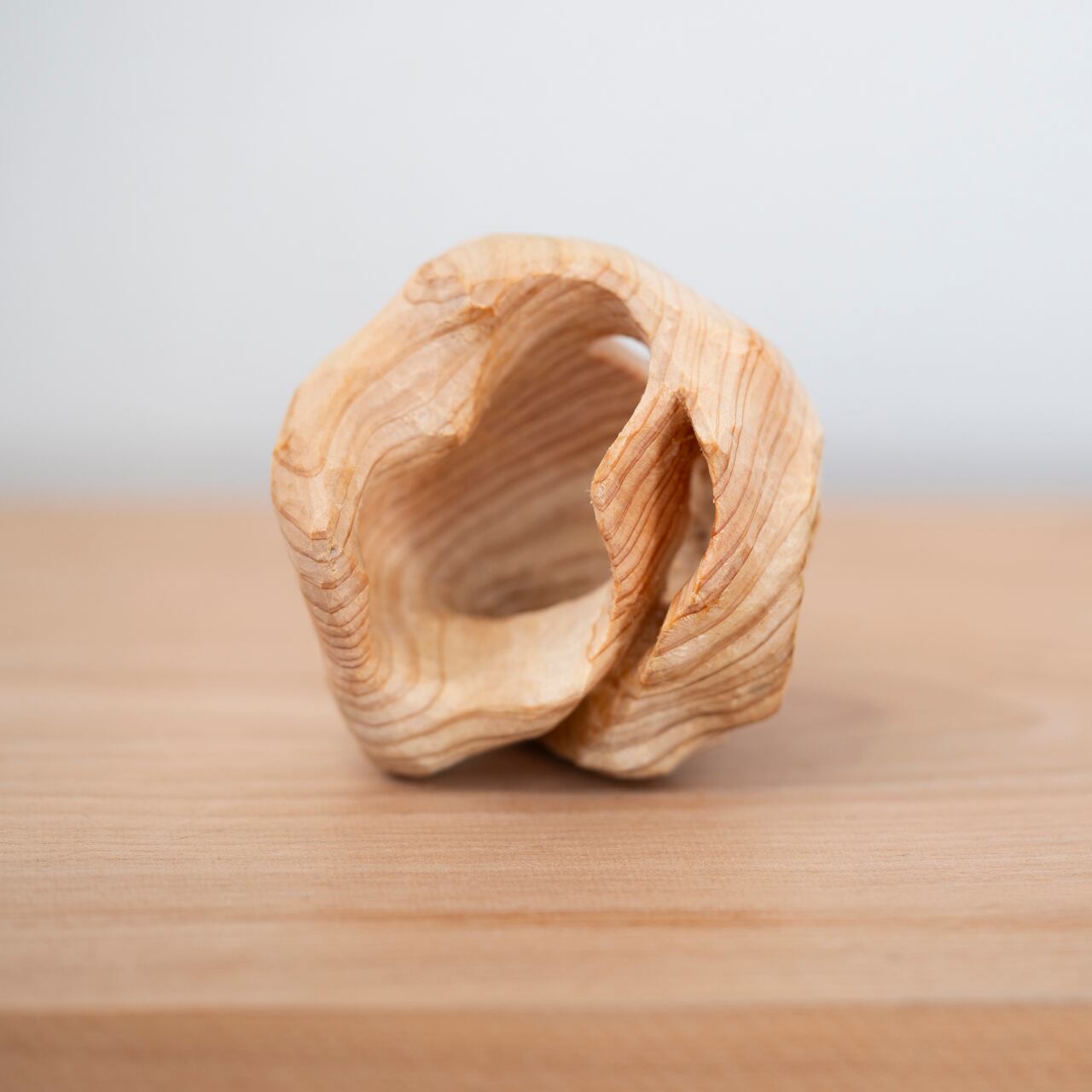 デザインを決めてから意図して彫ったいくつかのうねりと、彫り進める中で意図せずにあらわれた曲線から発想を得て彫ったうねりが共演し、ひとつの興味深いかたちが形成されました。
