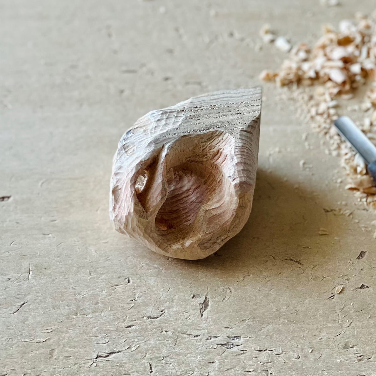 The carving of some undulations that I intended to carve after deciding on the design and others that were inspired by curves that appeared unintentionally during the carving process played together to form an interesting shape.