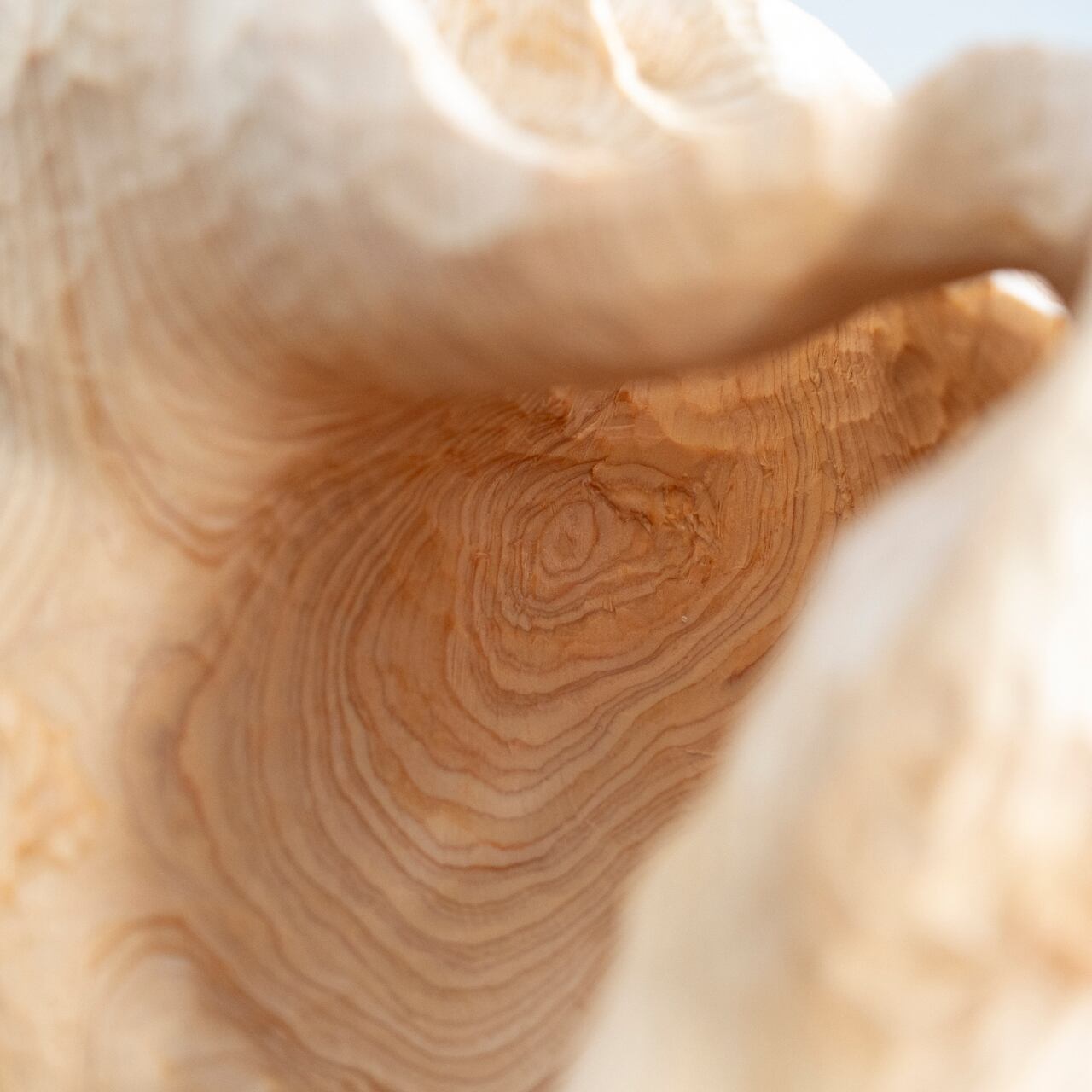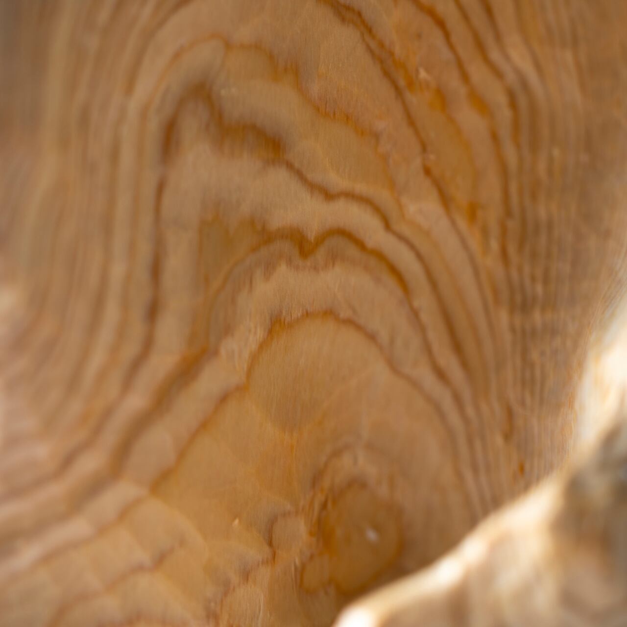 ひのきは彫刻されると木目が明瞭にあらわれます。彫られる向きや深さによって、さまざまな曲線の木目が踊る様子を楽しむことができます。特にこのひのき材には色が濃く深い部分と薄く淡い部分があることで、豊かな色の変化も感じられます。