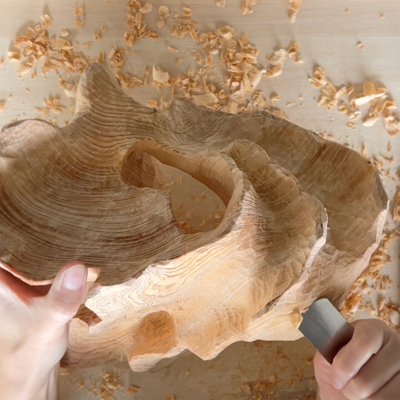 This is one of the largest pieces of wood I have ever worked on, weighing 5.9kg before carving and less than a quarter of that when finished. Many areas were carved against the grain of the wood. This was hard work and the chisel blades were easily damaged. However, the cross section of the wood allows you to see the annual rings that have been accumulated over many years, which are proof that the tree has lived. The ivory colored thing in the video is reusable clay. At first, I think about what kind of shape I would like to create with the clay. Based on that, I carve the same shape as the clay.