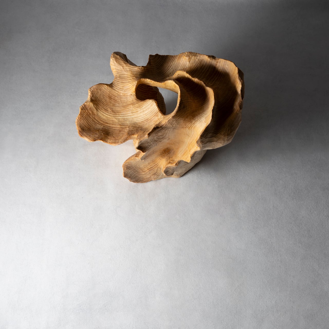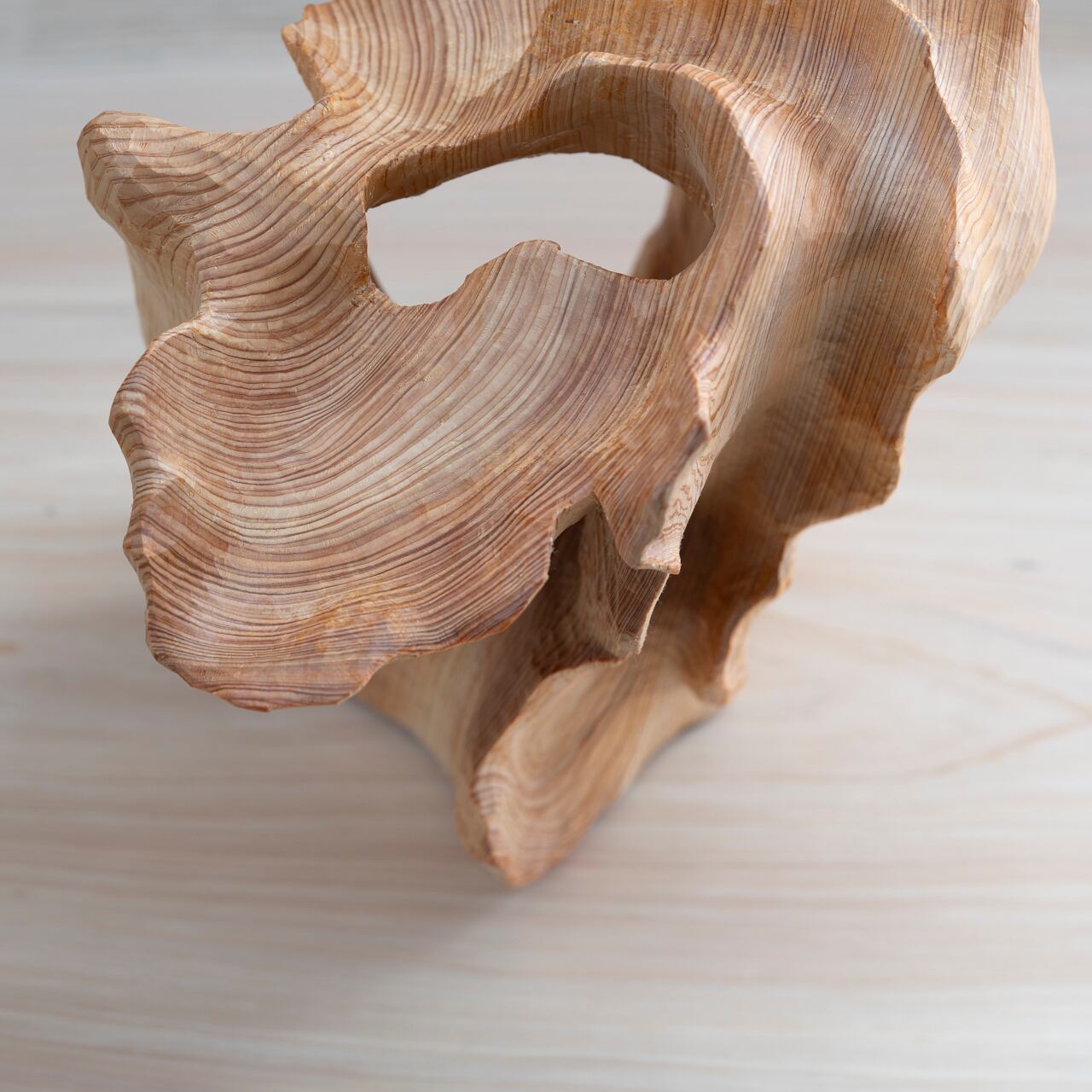 上部から眺めたときの姿は、樹冠を表しています。うねりや曲線たちは、重い雪や風を受け入れながらも、その樹木が空へ向かって伸びて行く意志を感じさせるでしょう。その写真は、この作品と同じひのき材を展示台にして撮影されました。